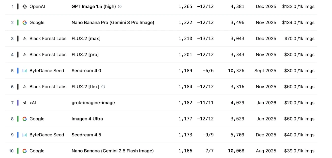 La hiérarchie dans le marché des générateurs d’images semble aujourd’hui figée, avec à sa tête les acteurs les plus populaires sur le marché. Selon le classement de « Text-to-Image Arena », publié ce début d’année par Artificial analysis, OpenAI, Google, Black Forest Labs et ByteDance occupent le peloton de tête.